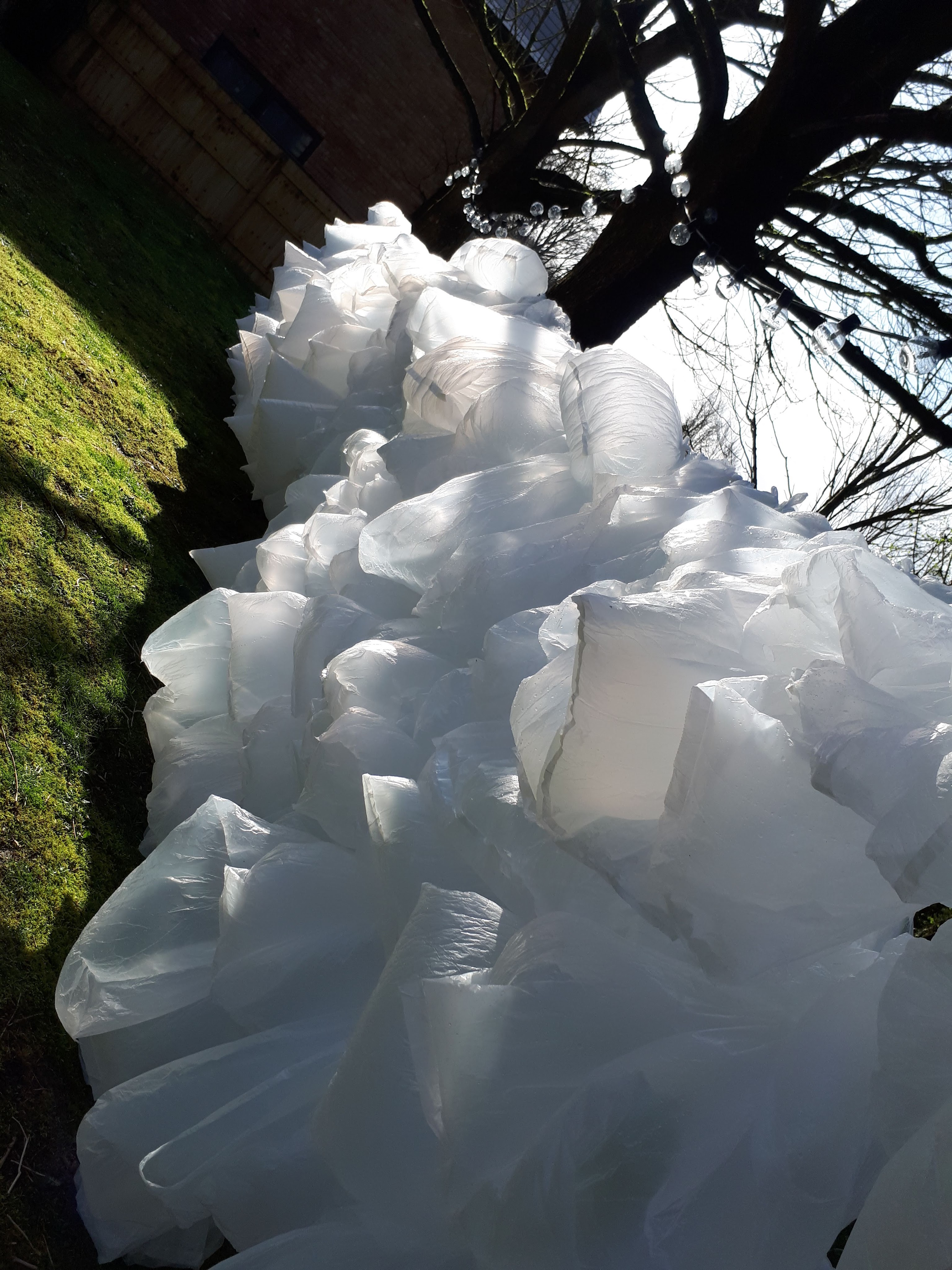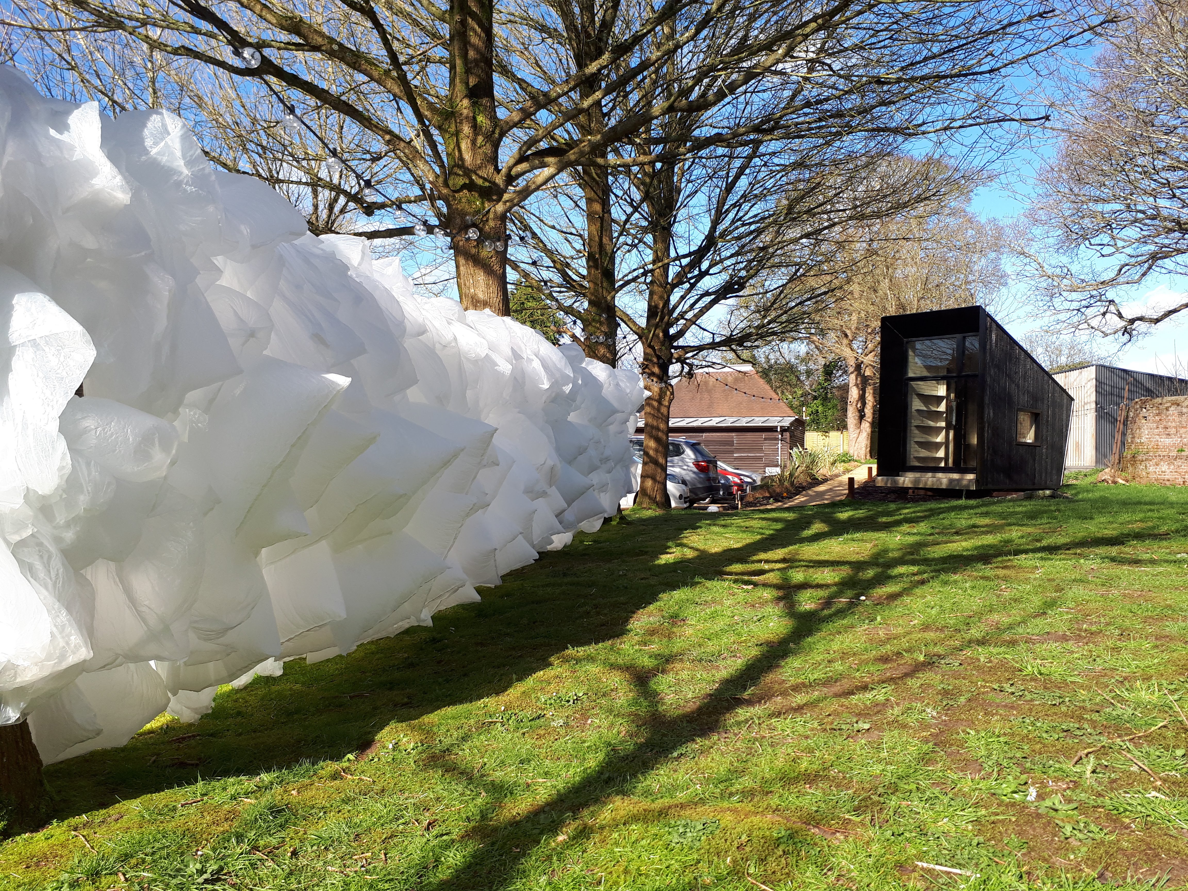 THE WHITE BAGS – Sculptural Drawing Installation / Recycled Biodegradable white plastic bags /cable/ Size: approx 226sq ft January 2020 / SPUDworks arts/ Sway/New Forest/England/ www.spudworks.co.uk