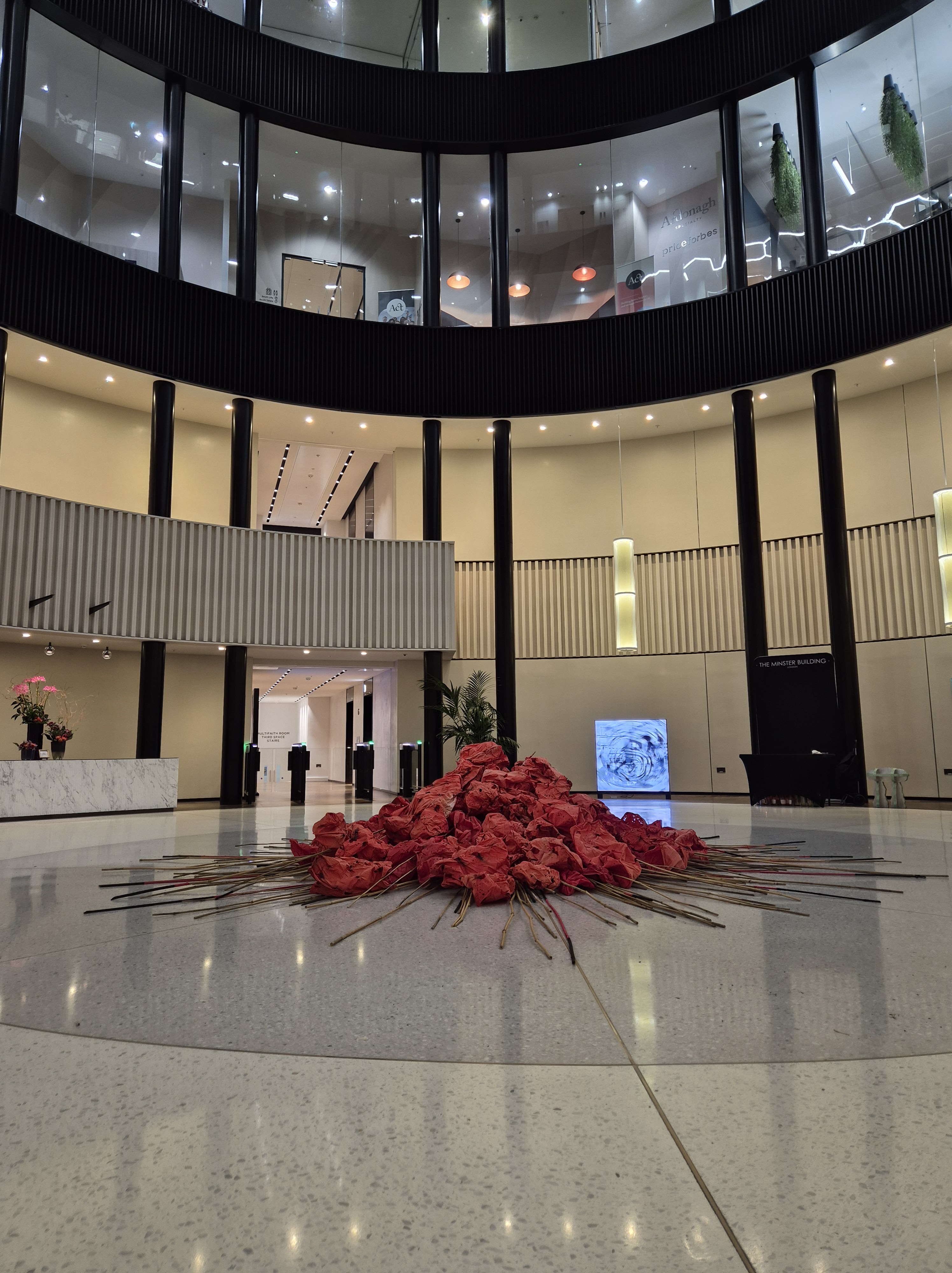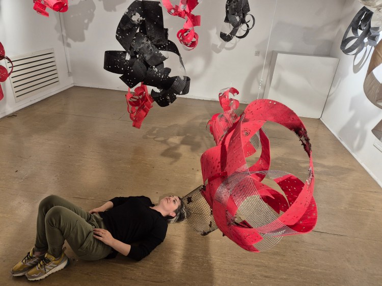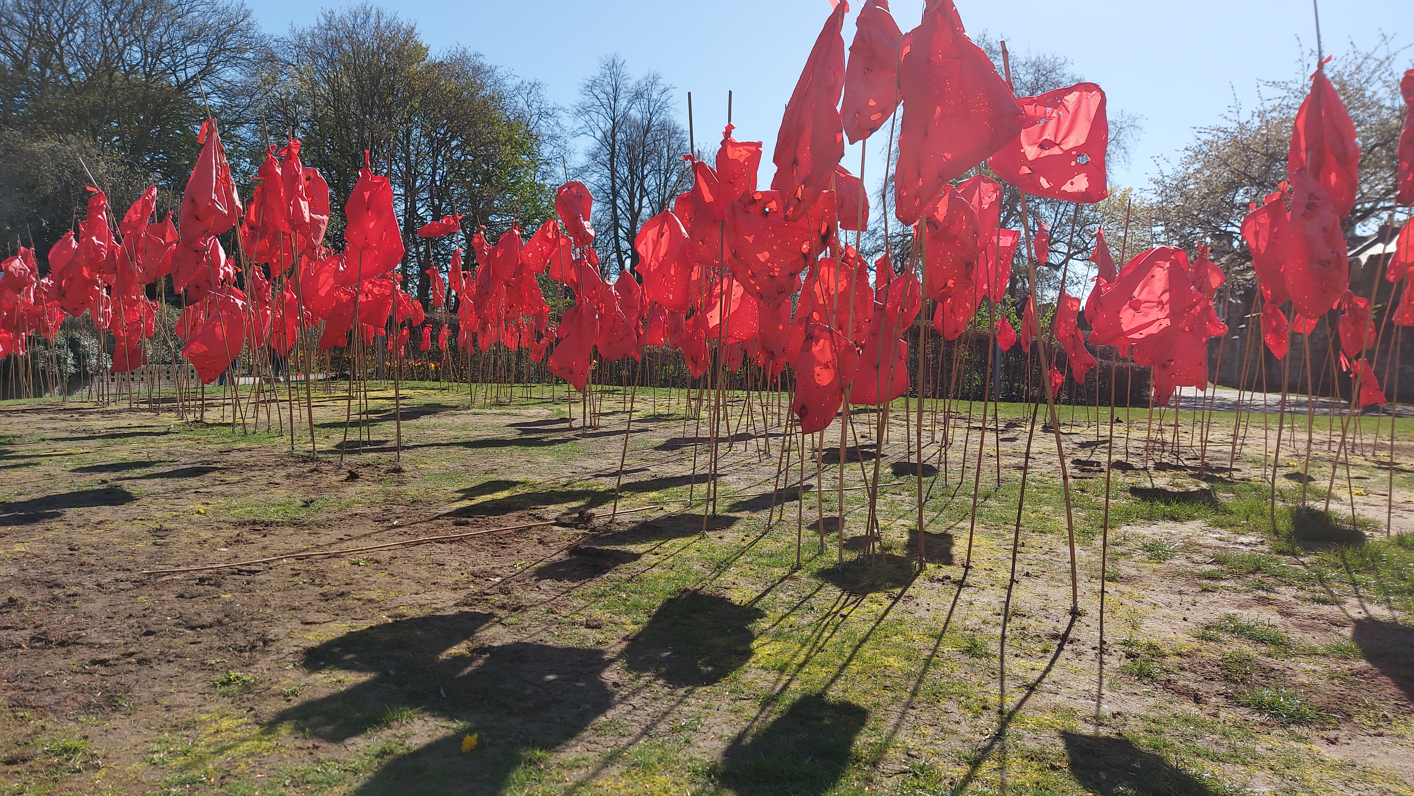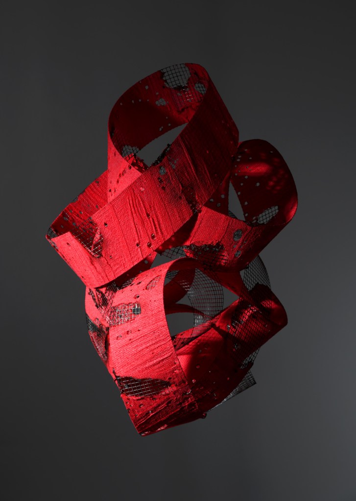 Aesthetica Art Prize Finalist 2023. FUTURE NOW Symposium 23-24 March 2023 – THE RED BAGS/SCULPTURALDRAWING / Recycled Repurposed lightweight canvas /Bamboo / Bullet Holes/