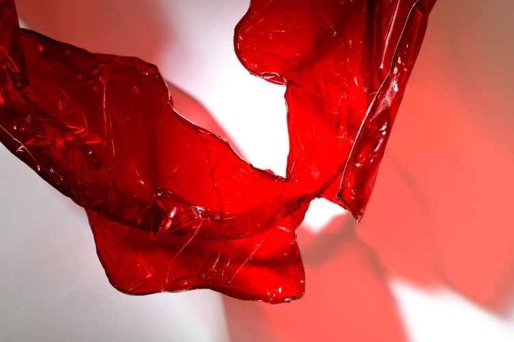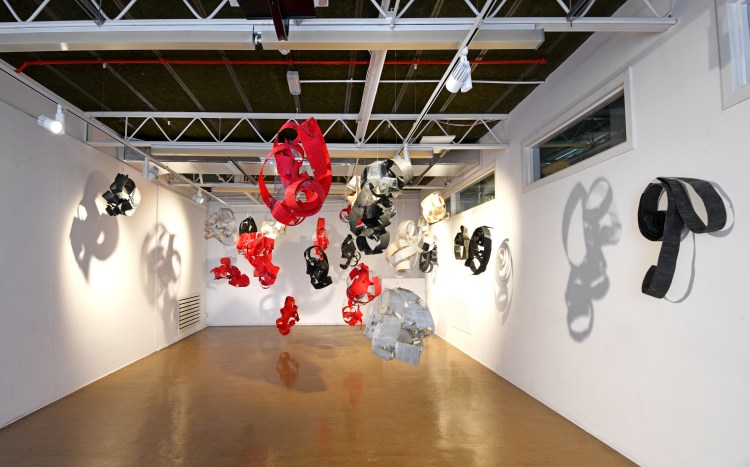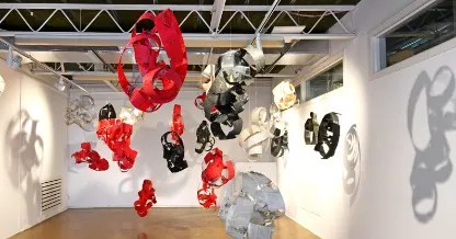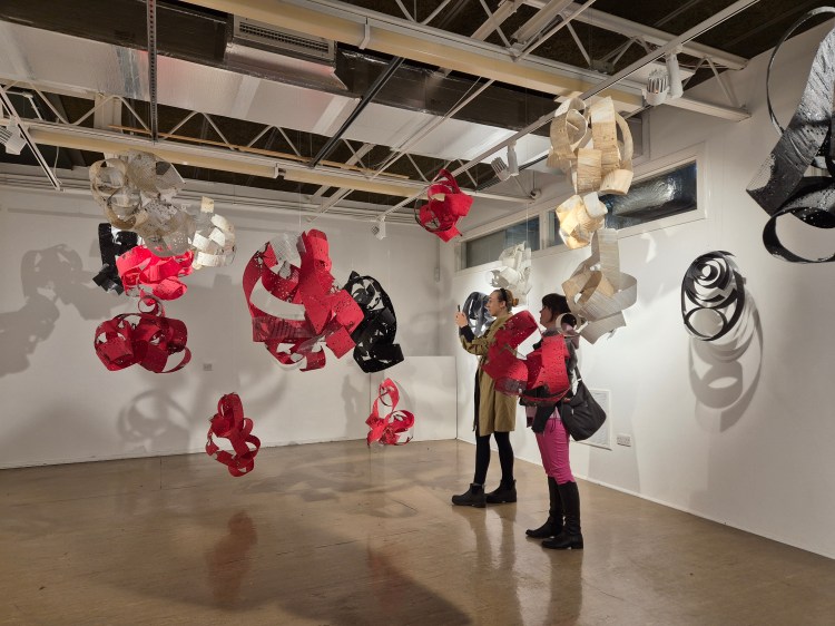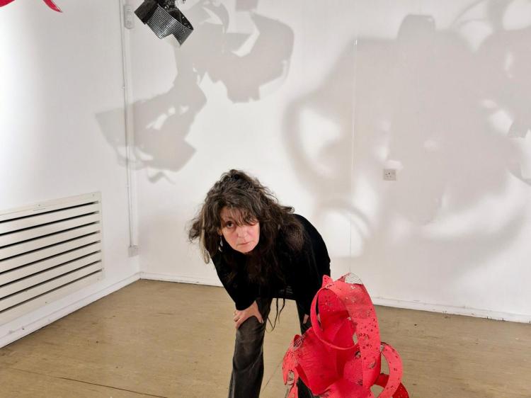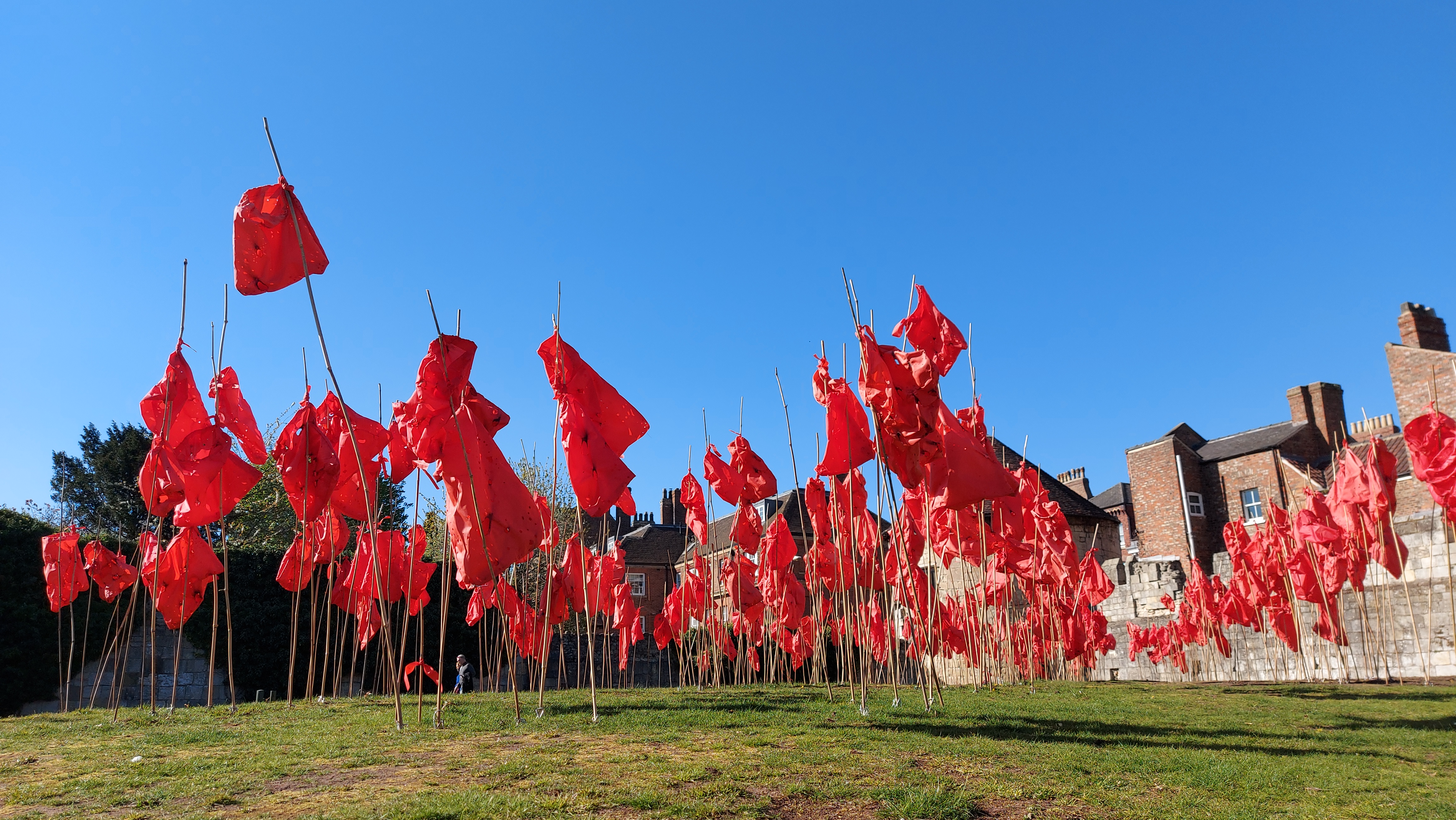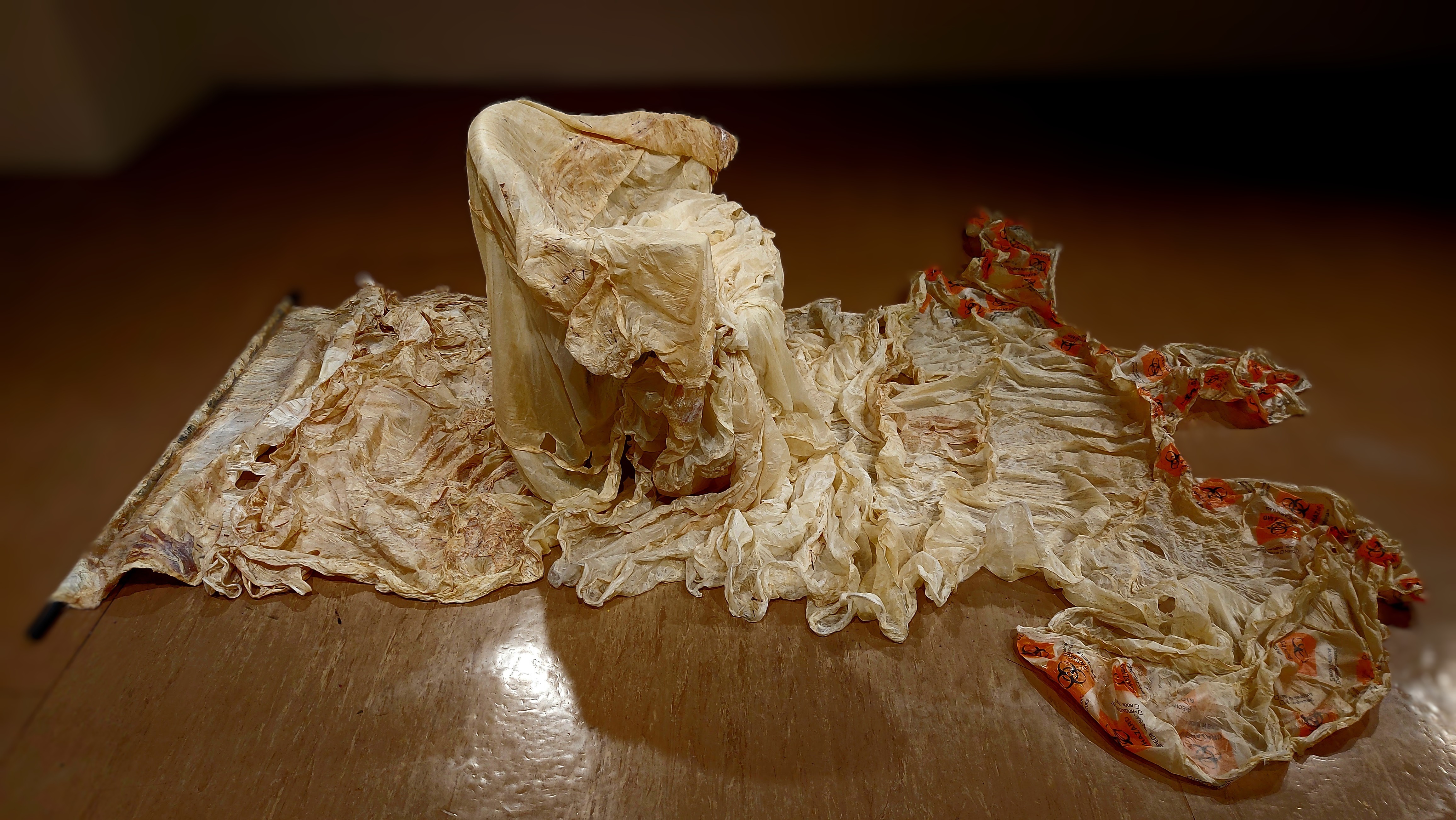Aesthetica Art Prize Finalist 2023. FUTURE NOW Symposium 23-24 March 2023 – THE RED BAGS/SCULPTURALDRAWING / Recycled Repurposed lightweight canvas /Bamboo / Bullet Holes/