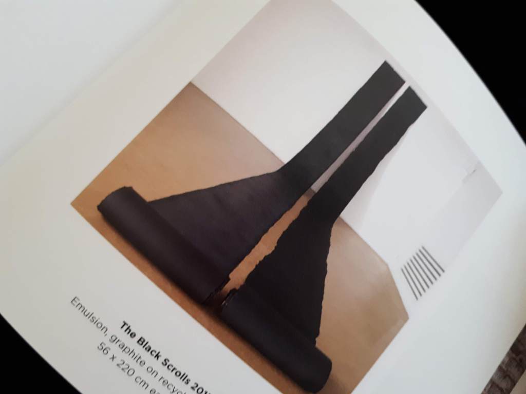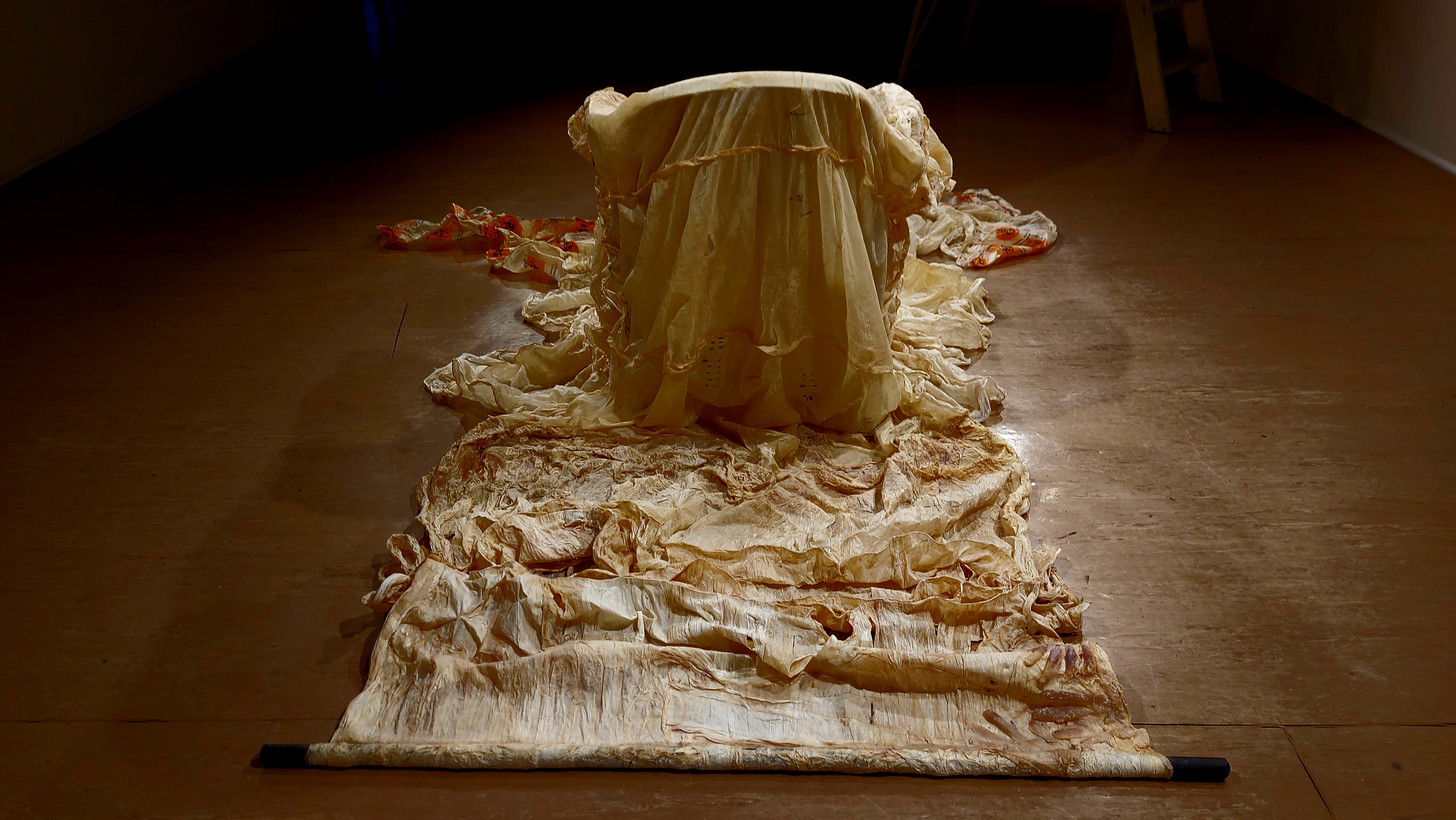 Salvaged Recycled lining paper/Graphite / Emulsion/ Gold trimmed edges/ Each Scroll- 27″(W) X 22m (L)