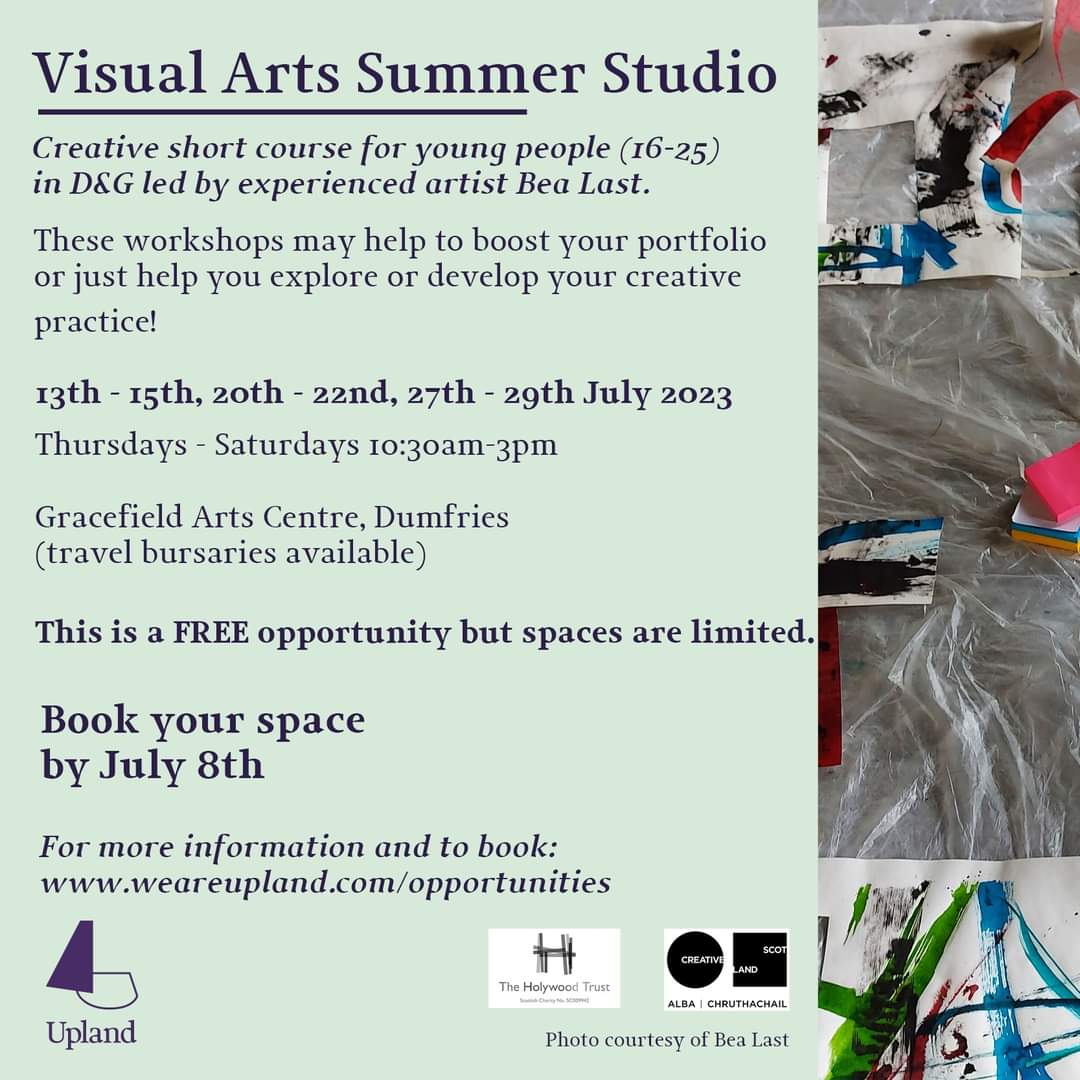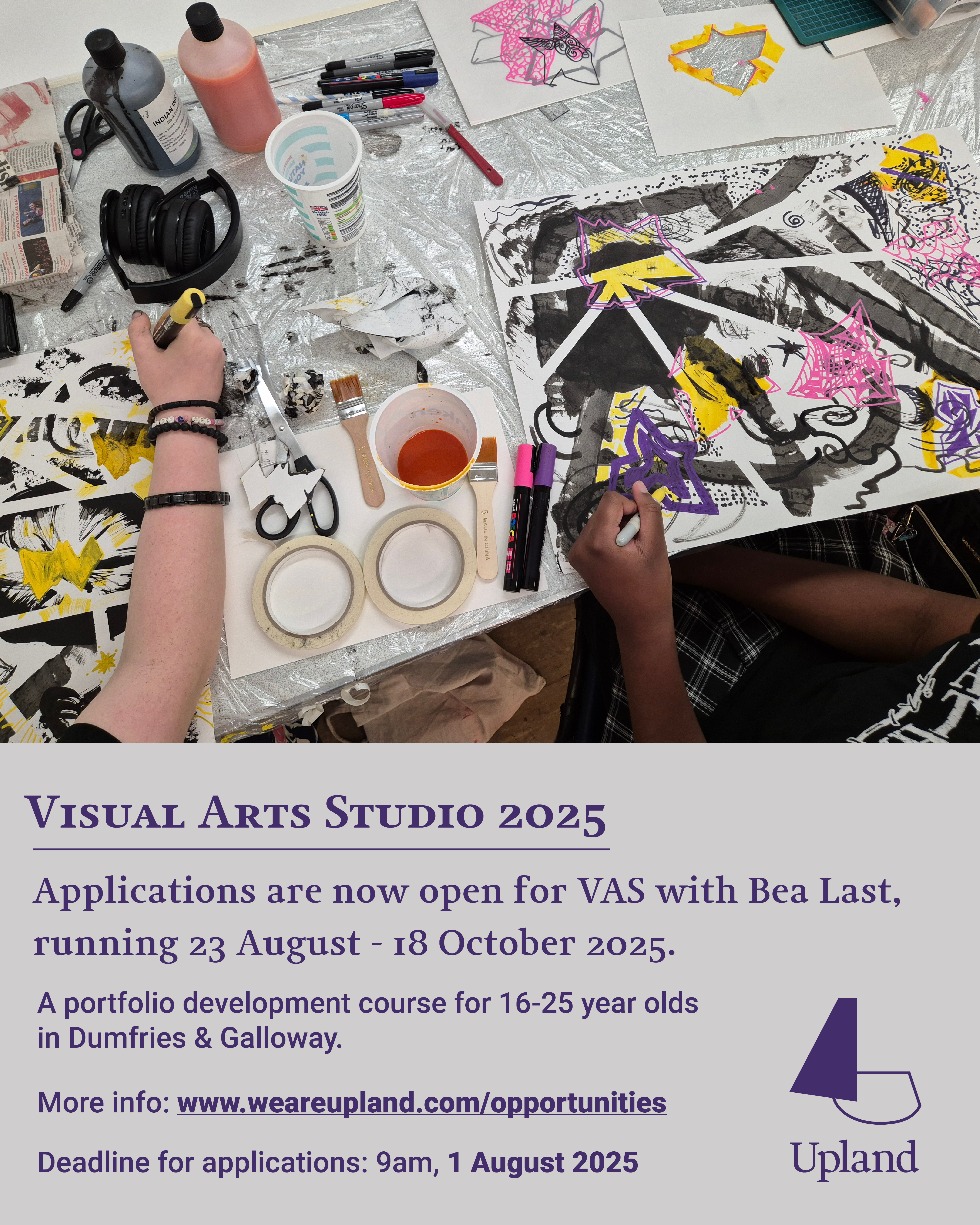 BEA LAST is also an Educator and Mentor. Under the arts organisation http://www.weareupland.com she has provided one to one mentoring and peer group sessions. Having facilitated the Glasgow School of Art’s Widening Participation Portfolio Preparation Course until 2020 Bea now facilitates VAS – Visual Arts Studio each year providing support towards students Portfolio applications based on Dumfries and Galloway Scotland.