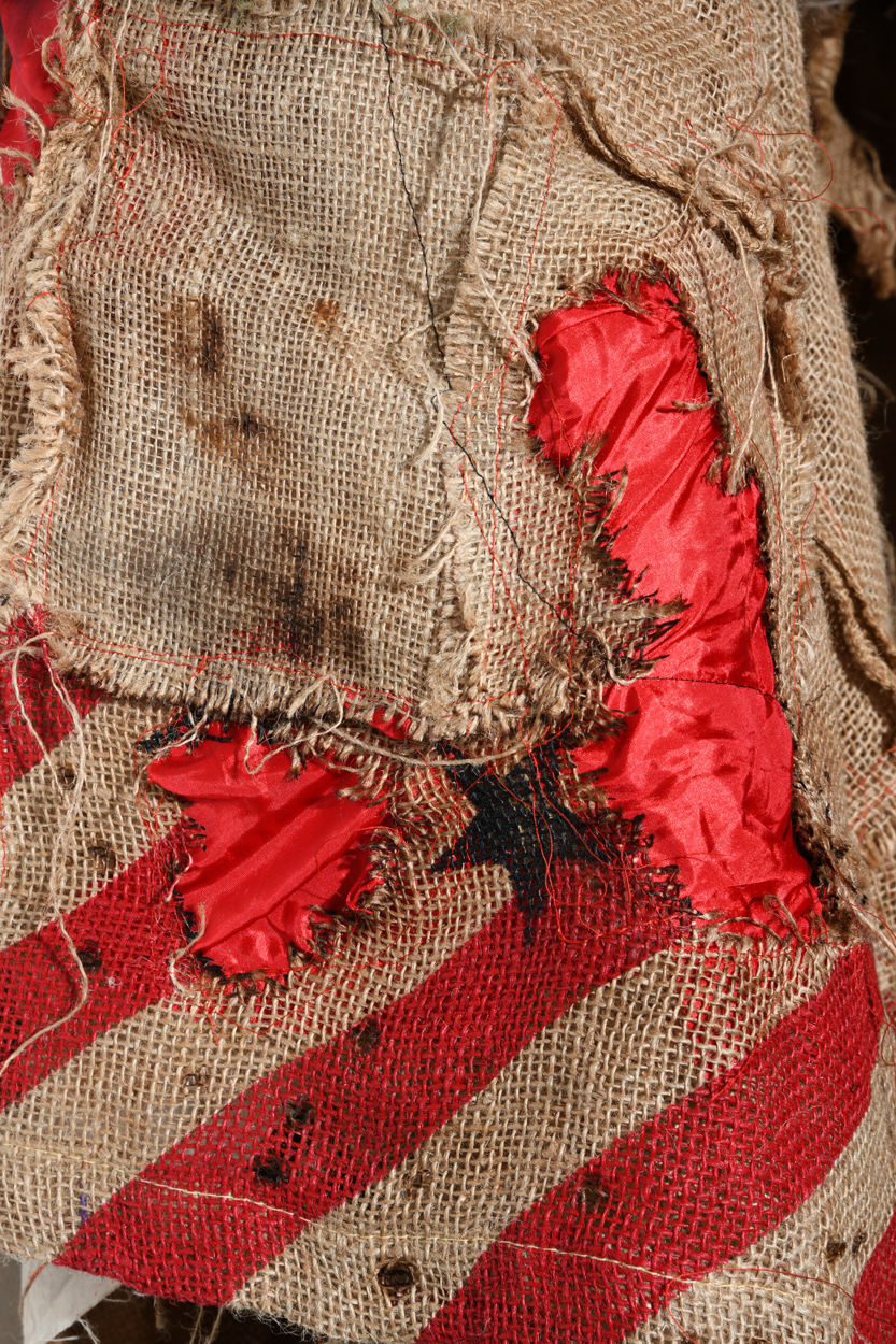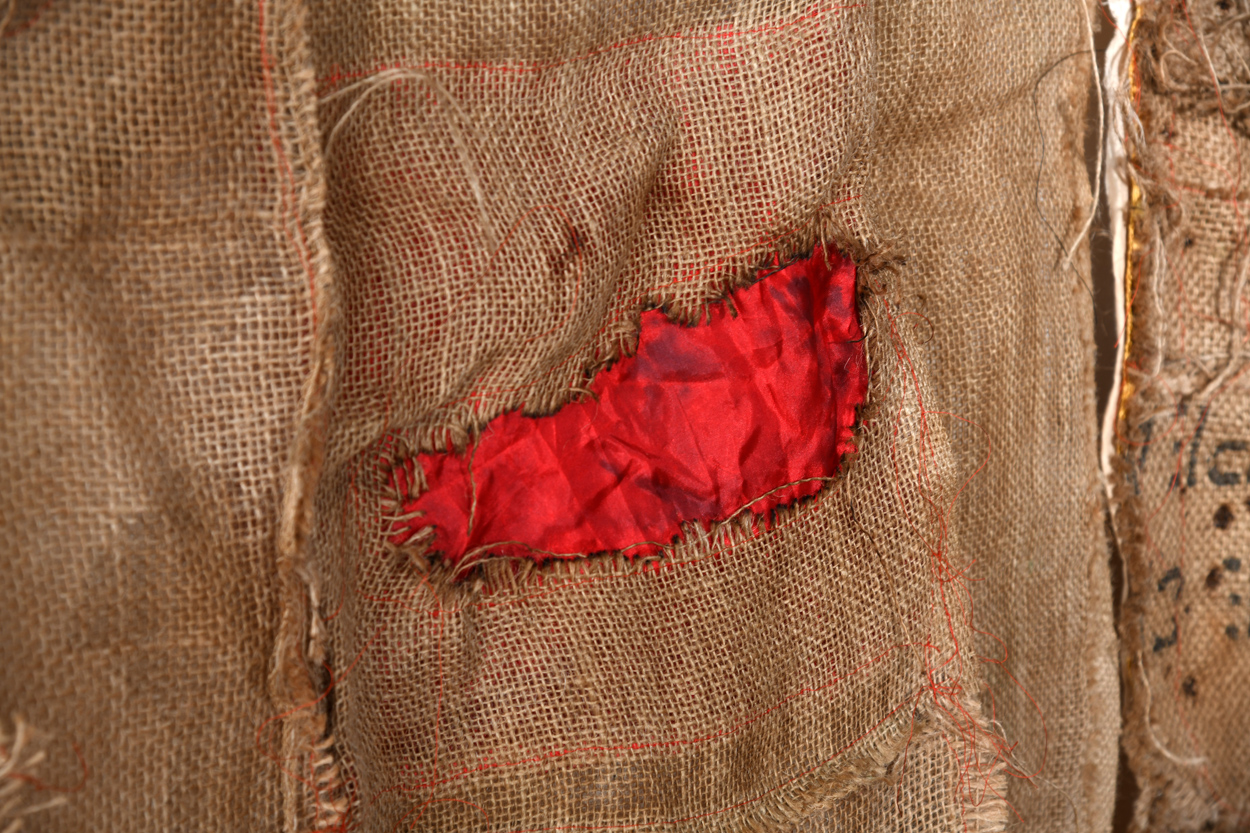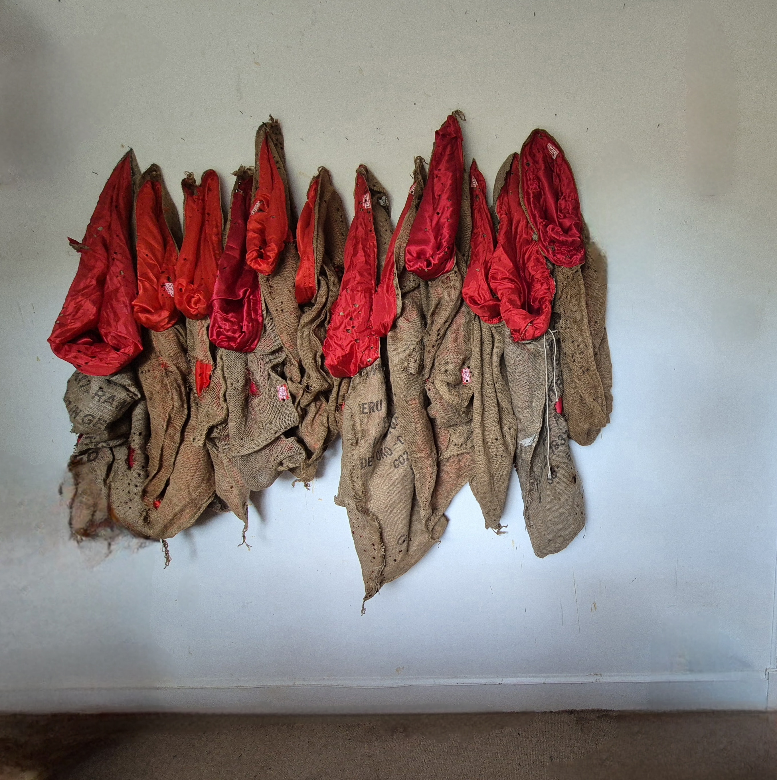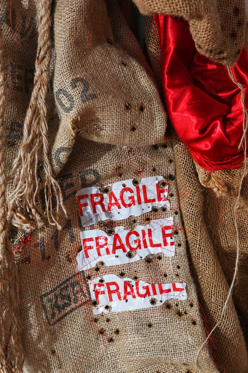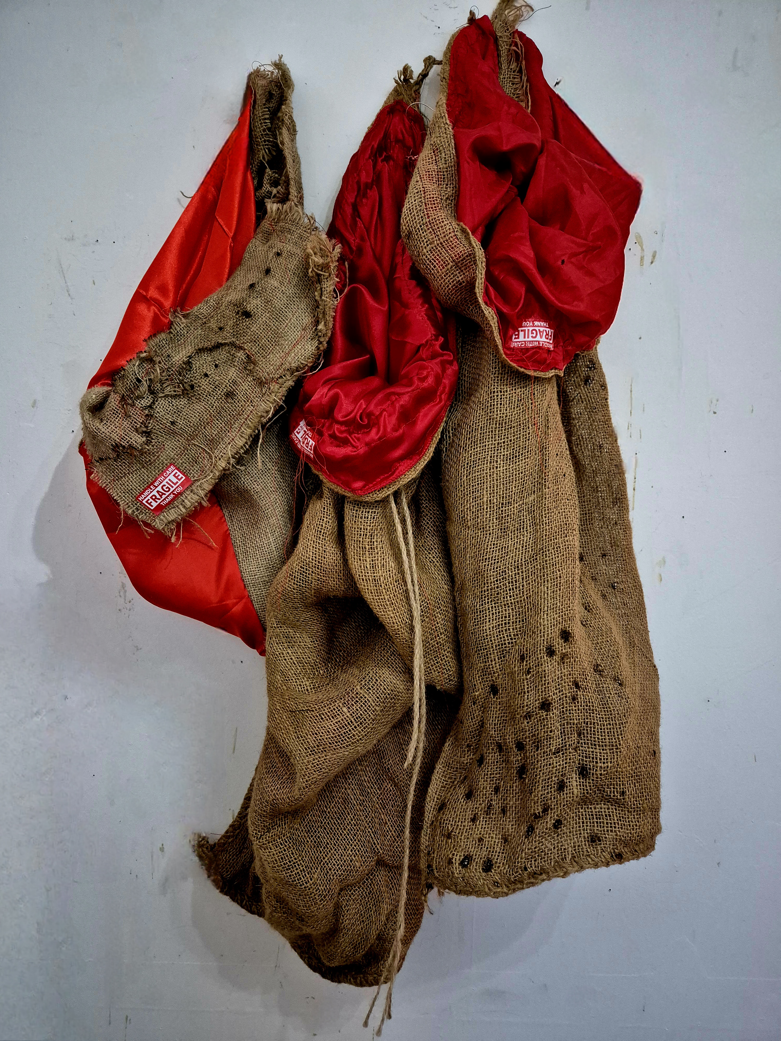 Hessian sacks / Red Satin/ Fragile Labels / Bullet holes